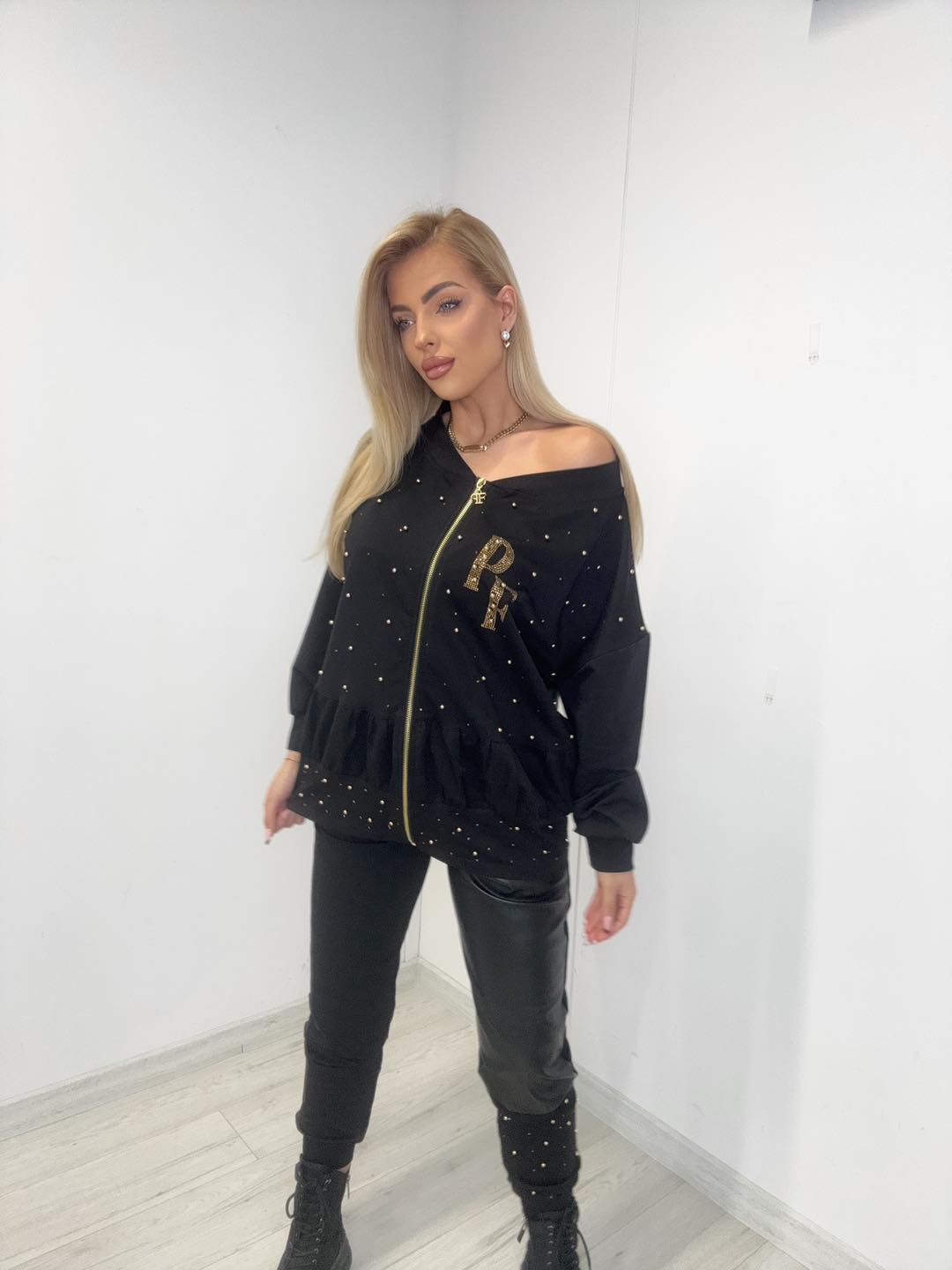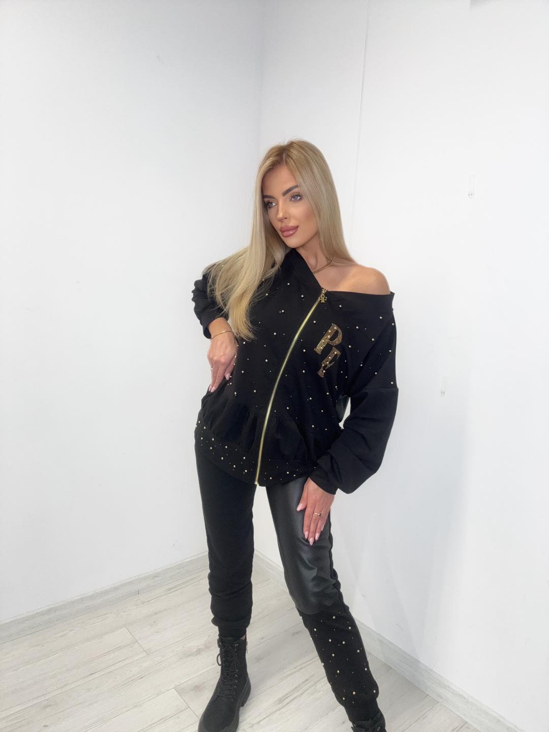 Bluza z przeszyciami, dekoracyjnymi nitami i złotym zamkiem jest nie tylko stylowa, ale również bardzo wygodna. Delikatna falbanka u dołu dodaje całości lekkości i kobiecego akcentu. Spodnie z ekoskórzaną nogawką i złotymi zdobieniami idealnie dopełniają całość, tworząc zestaw, który przyciąga wzrok i podkreśla modową odwagę klientek.