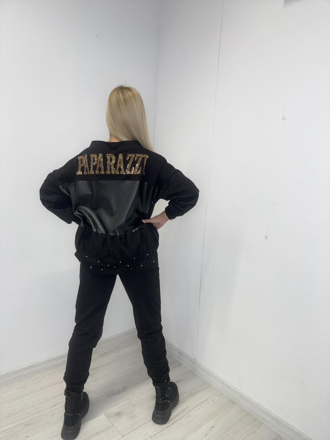 Czarny komplet z luksusowymi złotymi detalami to wyjątkowa propozycja premium dostępna w naszej hurtowni online. Model zachwyca połączeniem modnych materiałów — miękkiej dzianiny oraz wstawek z ekoskóry — które nadają stylizacji nowoczesnego charakteru. Zdobienia w postaci złotych aplikacji oraz efektowne logowanie „PAPARAZZI” na plecach sprawiają, że komplet prezentuje się ekskluzywnie i wyróżnia się na tle innych modeli dostępnych na rynku.