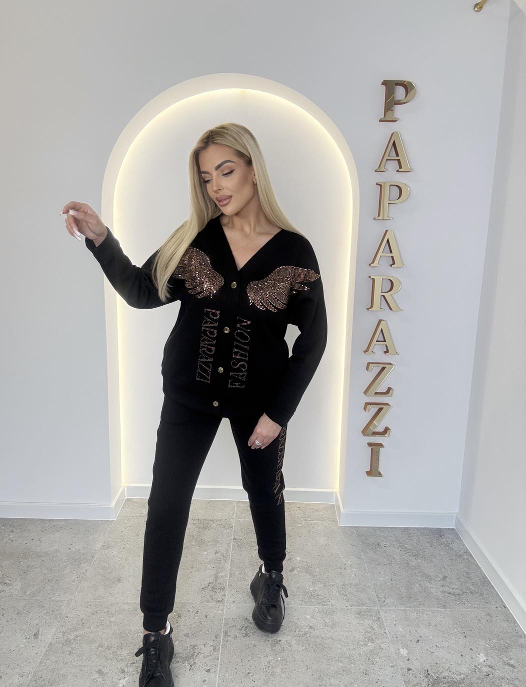 Bluza przyciąga uwagę bogatymi aplikacjami z cyrkonii w motywie skrzydeł oraz logowania Paparazzi Fashion, które nadają całości luksusowego, glamour’owego charakteru. Możliwość noszenia bluzy opuszczonej na jedno ramię podkreśla kobiecy, modowy look. Spodnie z elastycznym pasem i zwężaną nogawką zapewniają wygodę oraz świetne dopasowanie do sylwetki.