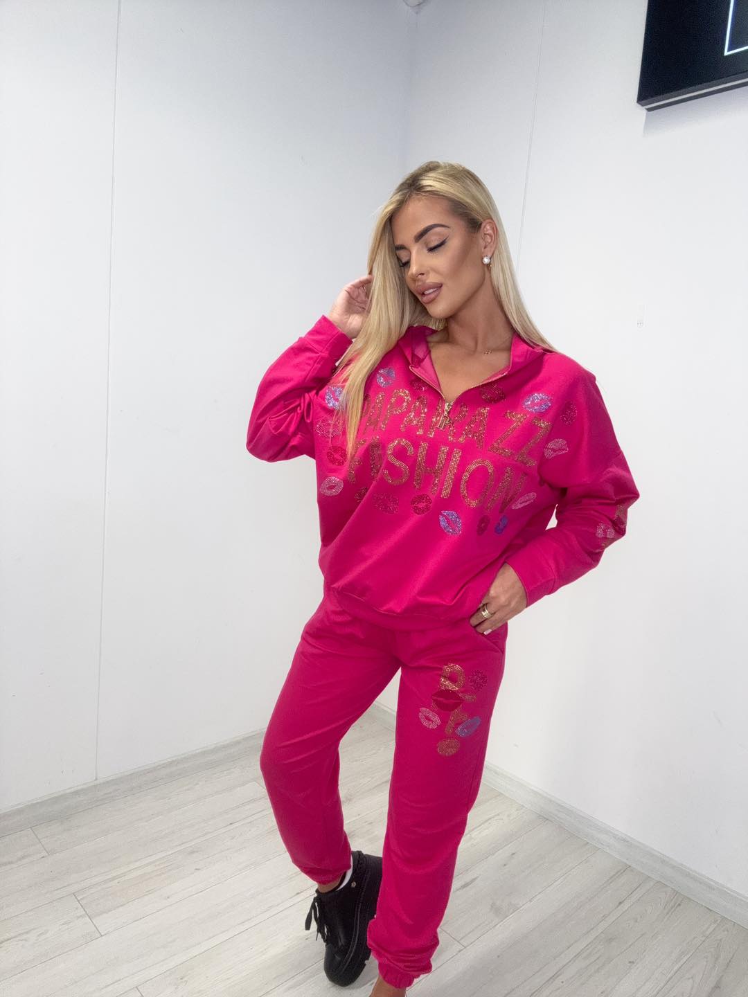 Dodaj koloru do swojej oferty! Ten różowy komplet dresowy to propozycja dla kobiet, które lubią energetyczne stylizacje i odważny design. Bluza z zamkiem, ozdobiona połyskującym nadrukiem „Paparazzi Fashion” i kolorowymi ustami, przyciąga wzrok i nadaje całości dziewczęcego charakteru. Spodnie z tym samym motywem tworzą spójny, nowoczesny look.