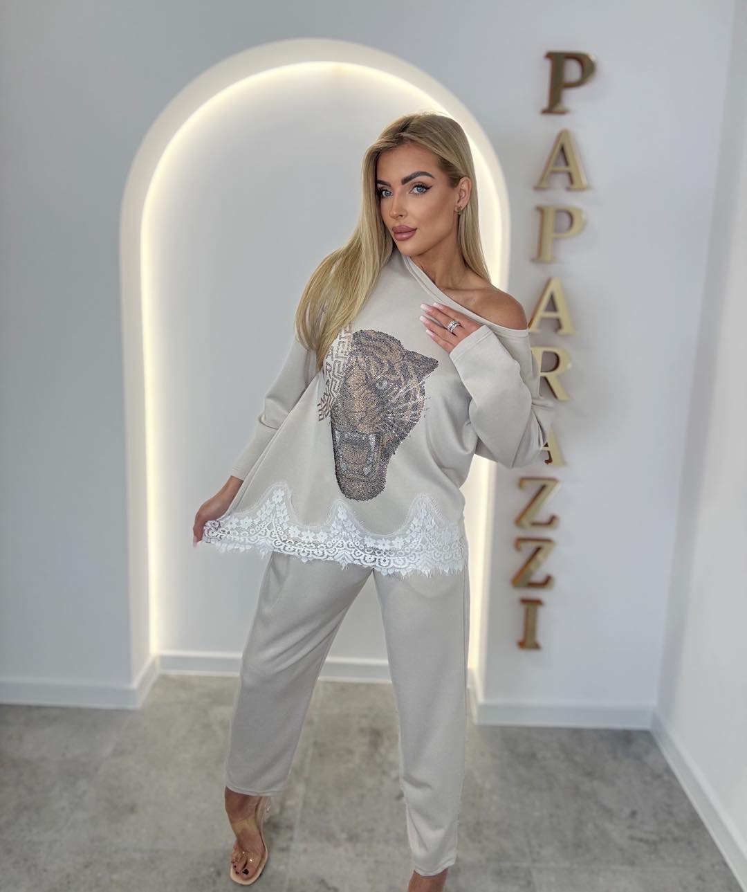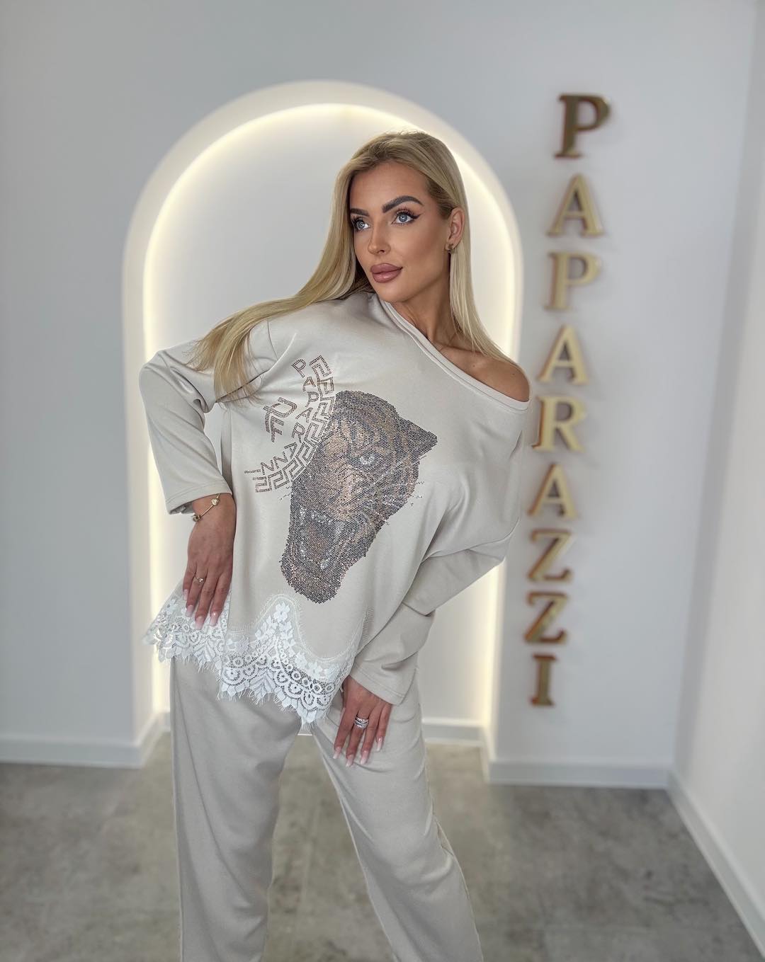 Bluzka wyróżnia się efektowną aplikacją z cyrkonii w motywie tygrysa (cyrkonie – nie haft), która nadaje całości wyrazistego, luksusowego charakteru. Koronkowe wykończenie u dołu dodaje kobiecej lekkości i subtelnej elegancji. Fason typu off-shoulder pozwala nosić bluzkę opuszczoną na jedno ramię, podkreślając modny look.