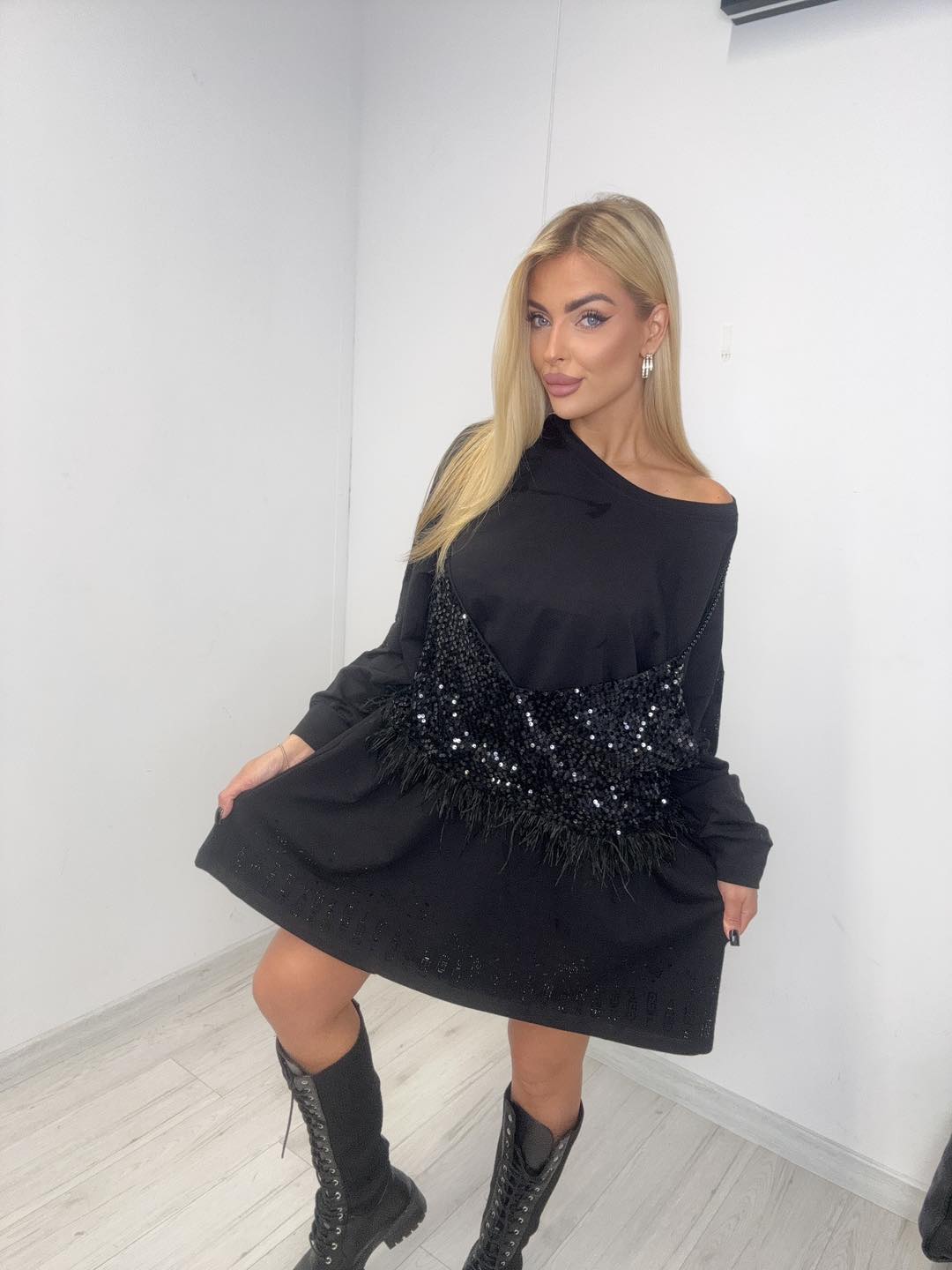 Model wyróżnia się efektownym zdobieniem z czarnych cekinów oraz subtelnymi piórami, które nadają całości wyjątkowego charakteru. Prosty krój w połączeniu z błyszczącymi elementami sprawia, że sukienka idealnie wpisuje się w trendy mody premium.