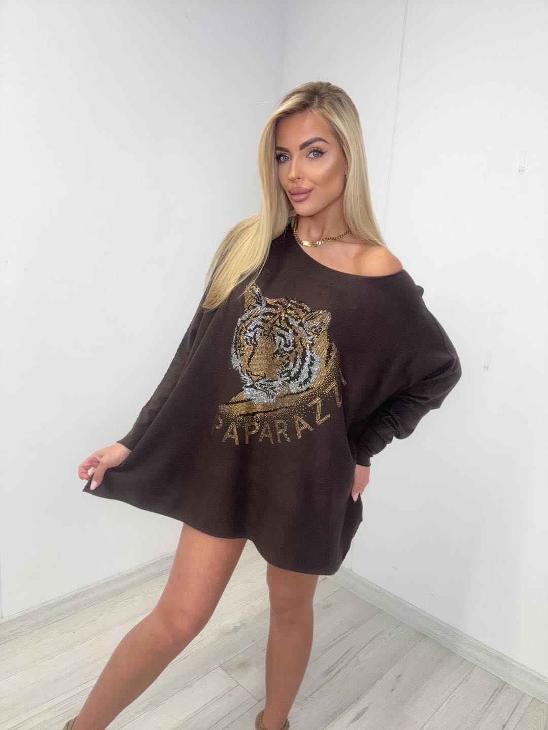 Sweter oversize PAPARAZZI „Golden Tiger” to must-have nadchodzącego sezonu dla butików, które stawiają na styl, jakość i mocny efekt wizualny. Model wyróżnia się luźnym, komfortowym krojem oraz efektowną aplikacją tygrysa wykonaną z połyskujących zdobień, które dodają całości luksusowego charakteru. Jedno ramię lekko opuszczone tworzy nowoczesny, kobiecy look idealny do codziennych stylizacji.